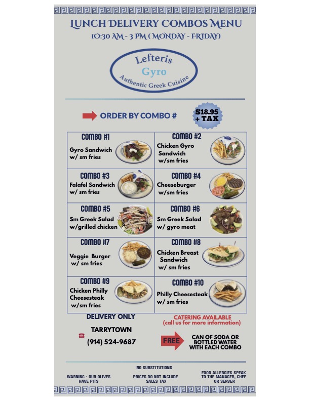 A classic Lefteris lunch with your choice of sandwich or salad, served with small fries and a complimentary soda or bottled water. Call now to order—phone orders only.
