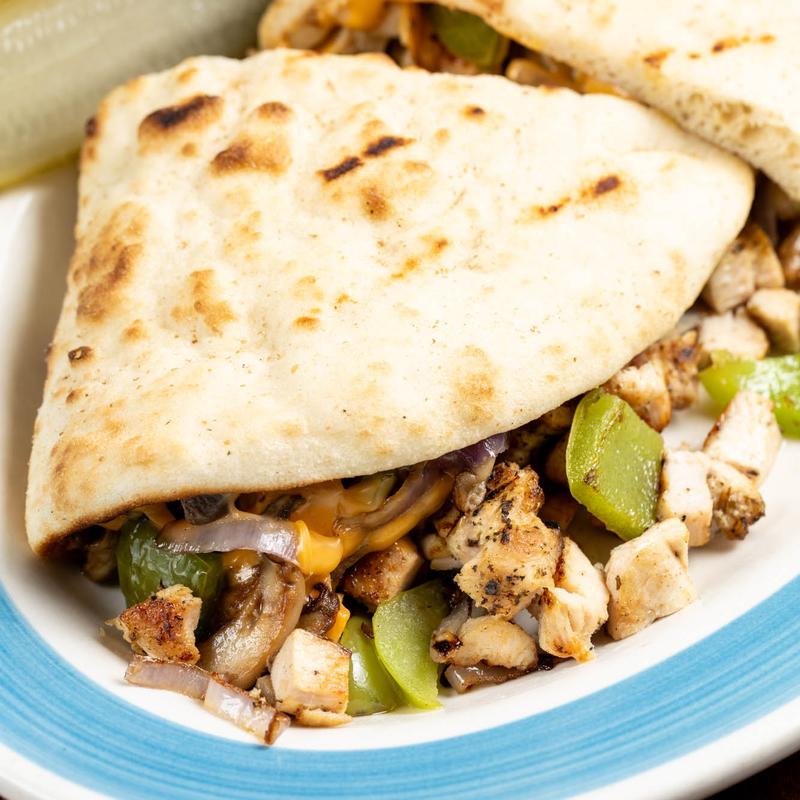 With mushrooms, onions, and peppers. Served with dinner Greek salad, pita bread and a choice of French fries or rice